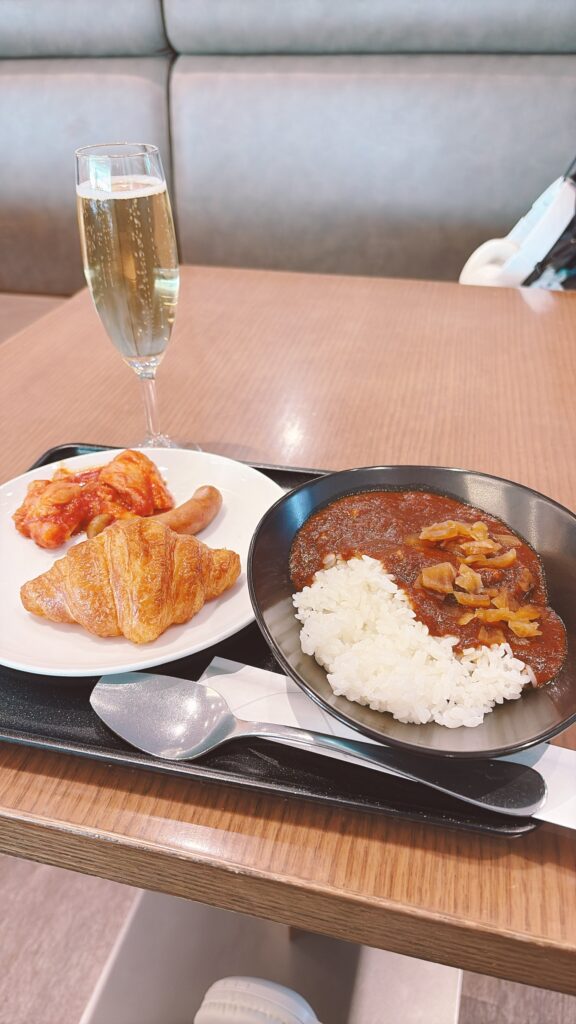 旅の始まりは羽田空港のサクララウンジから。 ここで絶対に外せないのが「JAL特製オリジナルビーフカレー」です。