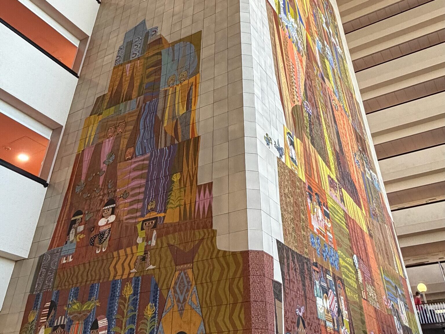 このホテルのシンボルといえば、巨大な吹き抜けに鎮座する高さ27メートルの壁画。手がけたのは伝説的アーティスト、メアリー・ブレア女史です。