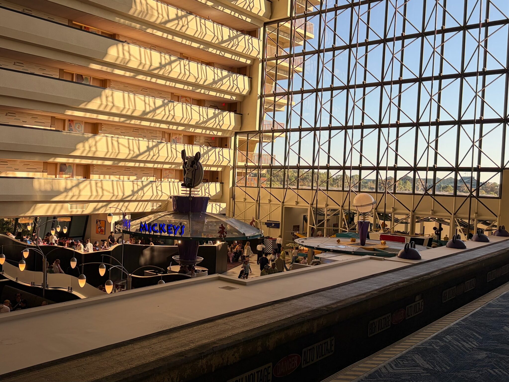 まず向かったのは、WDWの象徴的なホテル、ディズニー・コンテンポラリー・リゾート。 ロビーをモノレールが通り抜けるという、1971年の開業当時から変わらぬ前衛的な設計は、現代の目で見てもダイナミックです。